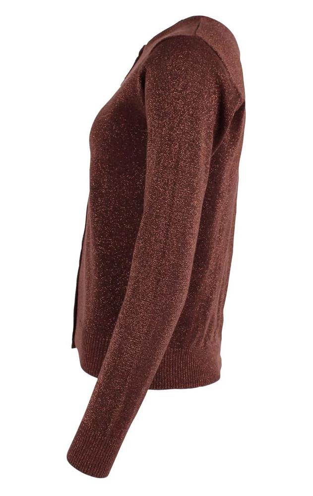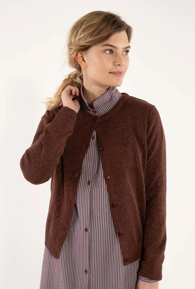 Weinrote Lurex-Strickjacke in schlichtem Design.