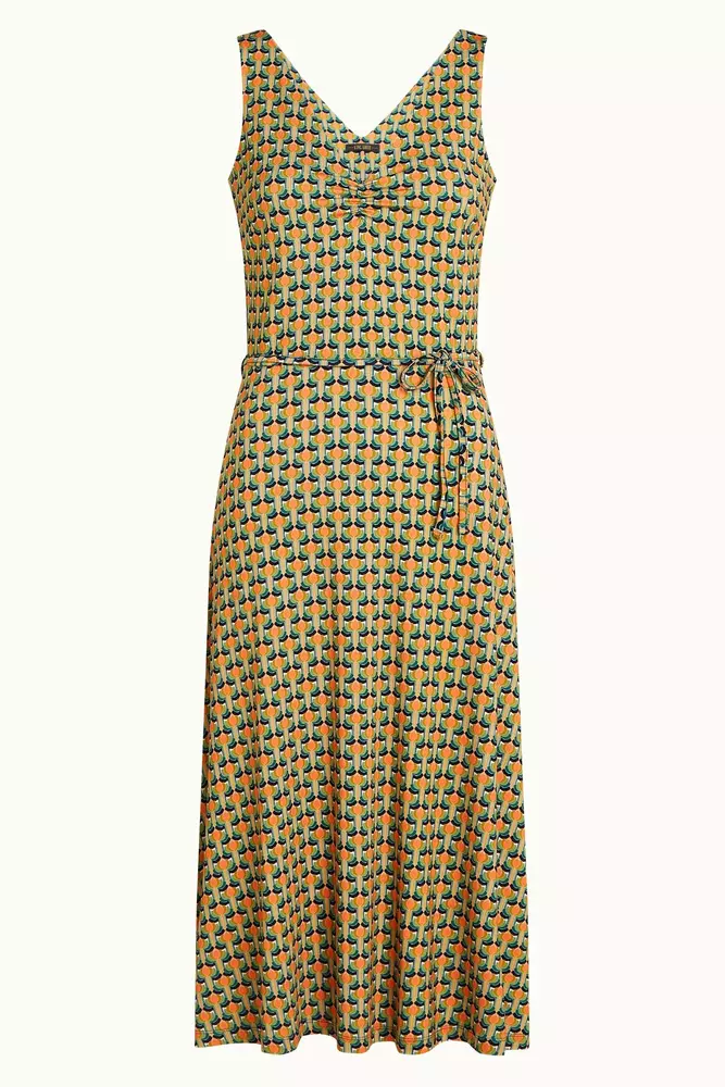 Das Kleid hat einen schöne Grafikprint, eine moderne Midi-Länge und einen schmalen Gürtel.