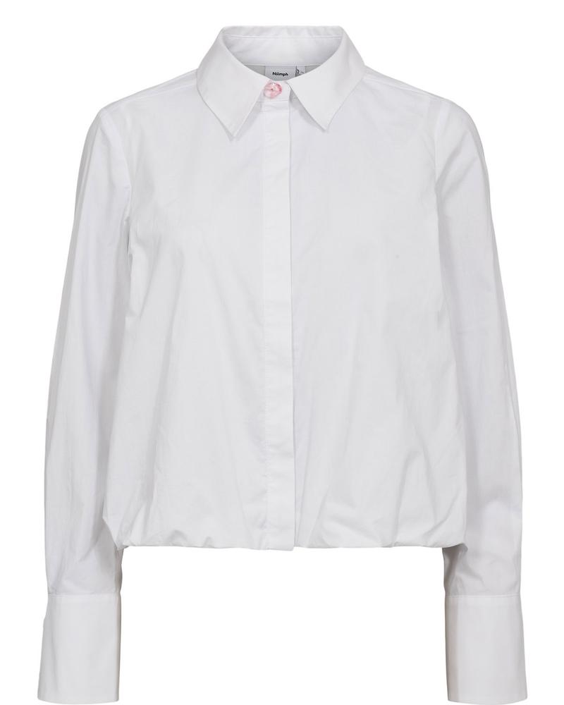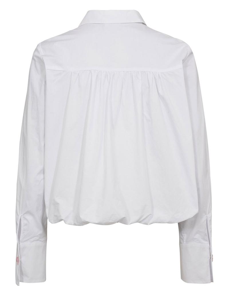 Die Bluse hat eine leicht verkürzte Länge und ist am Saum zusammengerafft, so dass sie glockig fällt. Die Ärmel münden in langen Manschetten.