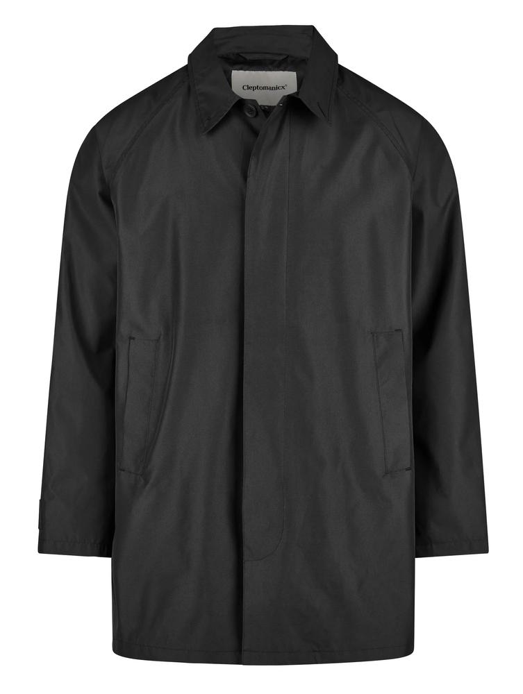 Der leichte Regenmantel hat einen geraden Schnitt mit klassischem Kragen und verdeckter Frontleiste.