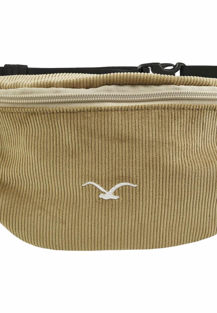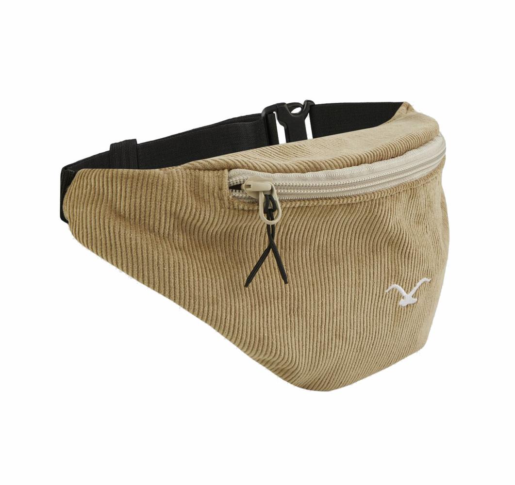 Hipbag aus Cord mit verstellbarem Gurt, Reißverschluss und einem weiteren Innenfach mit Reißverschluss. Die cleane Tasche ist aus reiner Bio-Baumwolle und mit einer Möwenstickerei versehen.