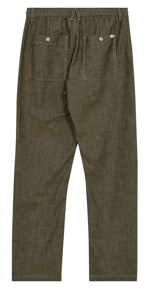 Die Hose hat kontrastfarbene Nähte an Taschen, Saum und Kanten.