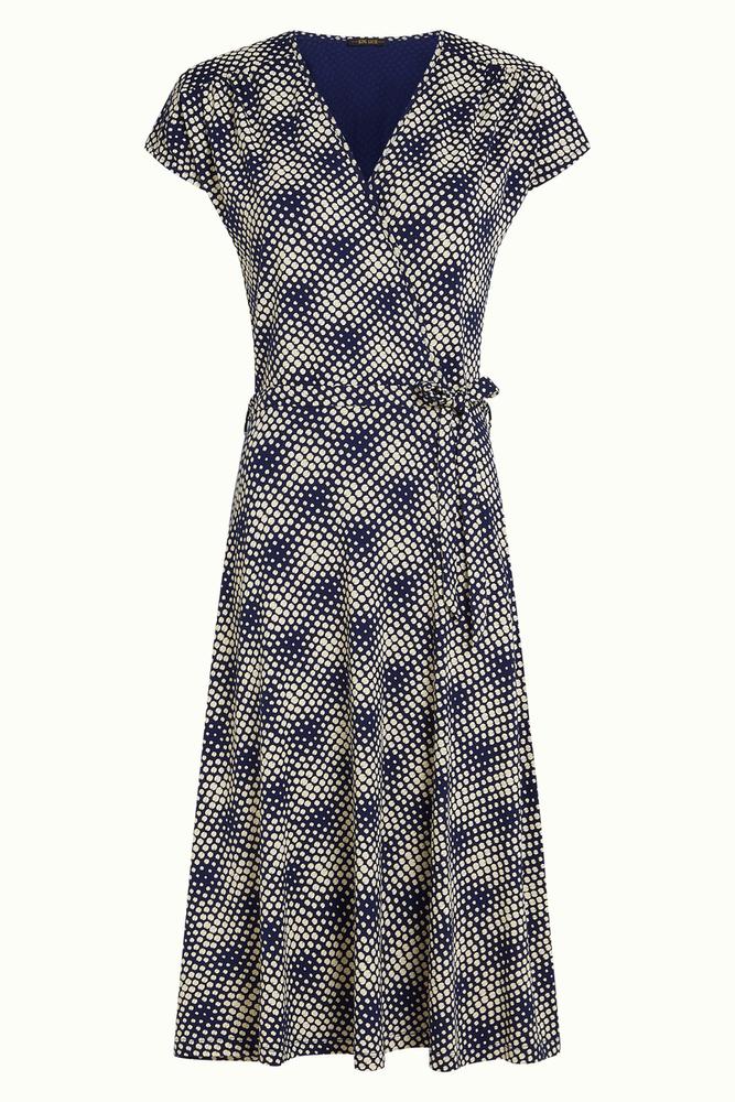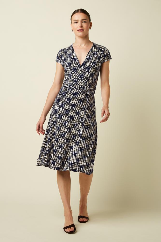 Das Kleid hat ein dezentes Muster in Blautönen, eine Wickeloptik, kurze Ärmel, einen tiefen V-Ausschnitt und einen Stoffeigenen Gürtel.